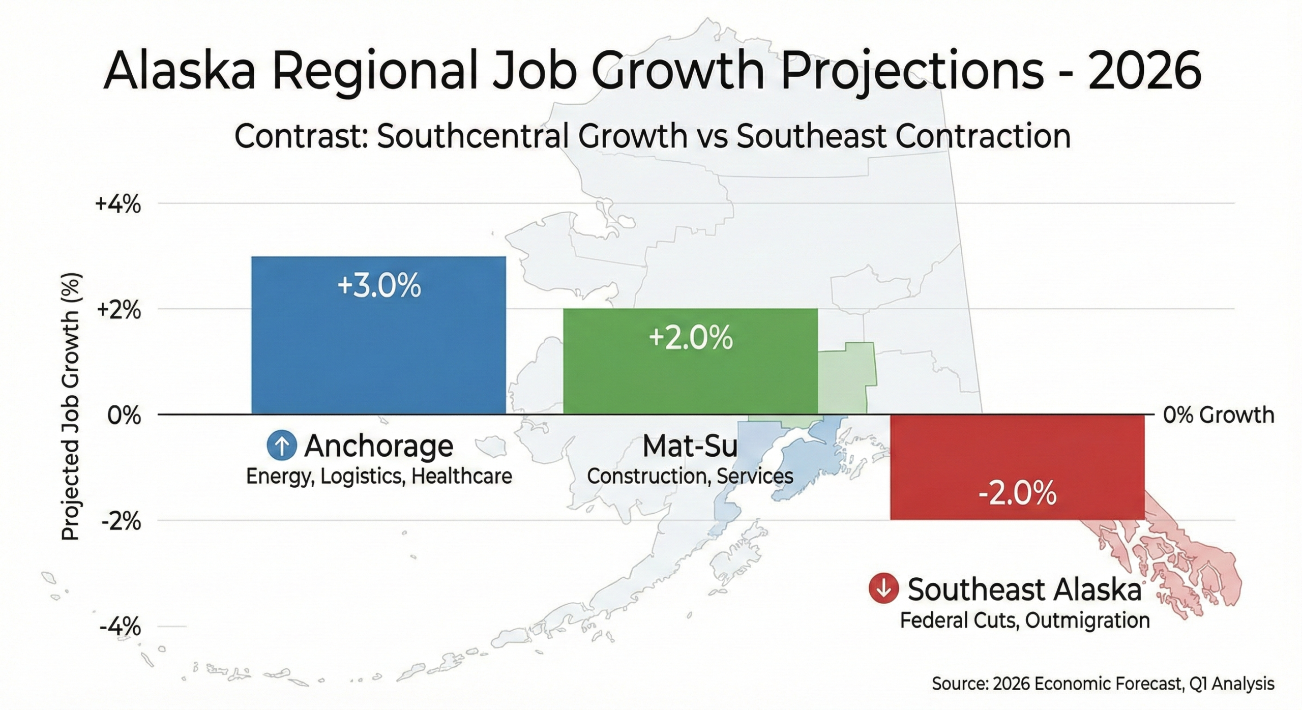 In contrast, Anchorage and the Mat-Su Borough are somewhat insulated by the dominance of private sector energy and logistics activity. This regional decoupling suggests that Anchorage will increasingly consolidate its position as the economic engine of the state, potentially drawing labor talent migrating from the contracting Southeast region.
